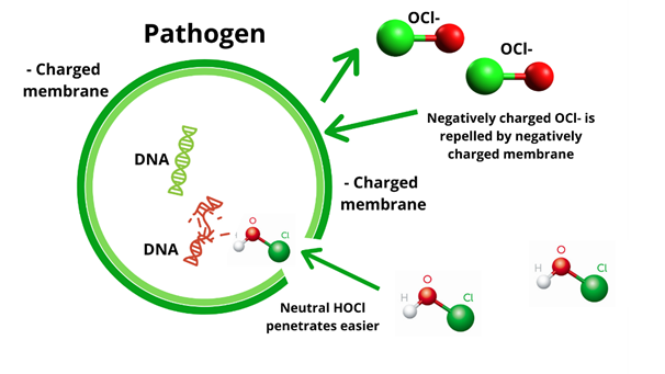 HOCl มีประสิทธิภาพในการฆ่าเชื้อได้ดีกว่า Hypochlorite (OCl–) หรือคลอรีนน้ำ กล่าวคือ HOCl ฆ่าเชื้อได้ดีกว่า 80-120 เท่าเลยทีเดียว